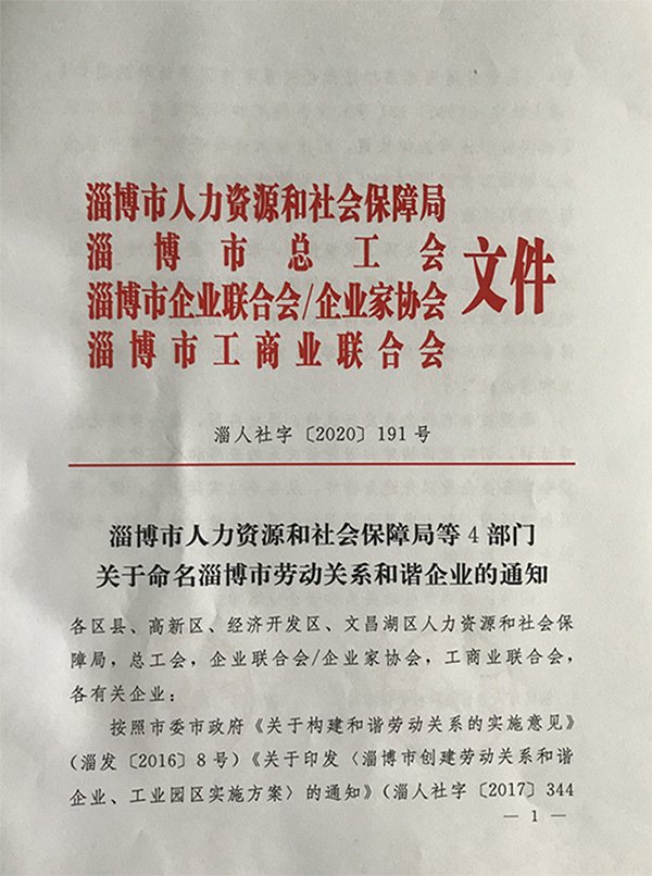 日前,公司順利通過淄博市人力資源和社會保障局、淄博市總工會、淄博市企業(yè)聯(lián)合會/企業(yè)家協(xié)會、淄博市工商業(yè)聯(lián)合會等4部門關(guān)于開展淄博市和諧勞動關(guān)系考核測評,被評為淄博市模范勞動關(guān)系和諧企業(yè)。