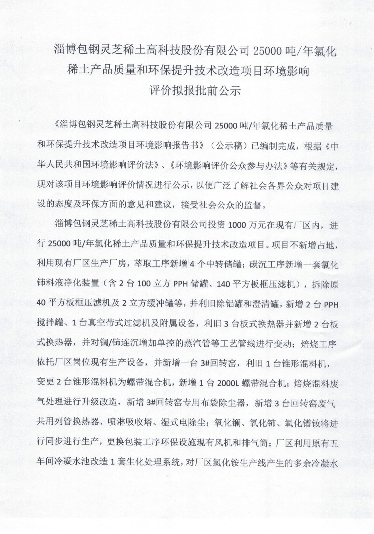 淄博包鋼靈芝稀土高科技股份有限公司25000噸/年氯化稀土產品質量和環(huán)保提升技術改造項目環(huán)境影響評價擬報批前公示